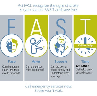L”ictus presenta quattro segni di allarme comuni che sono noti con l”acronimo ‘FAST’, ovvero Face, Arms, Speech, Time (viso, braccia, linguaggio e tempo). ‘Face’ indica un emivolto cadente o la linea della bocca irregolare. Quanto ad ‘Arms’, un individuo colpito da ictus può fare fatica a sollevare le braccia alla stessa altezza e a mantenere questa posizione. ‘Speech’ si riferisce alla difficoltà a pronunciare le parole, a dire frasi di senso compiuto o a seguire le istruzioni date. Il tempo (‘Time’) è un fattore fondamentale: se un individuo dovesse evidenziare questi sintomi, è fondamentale chiamare immediatamente i servizi di emergenza medica.